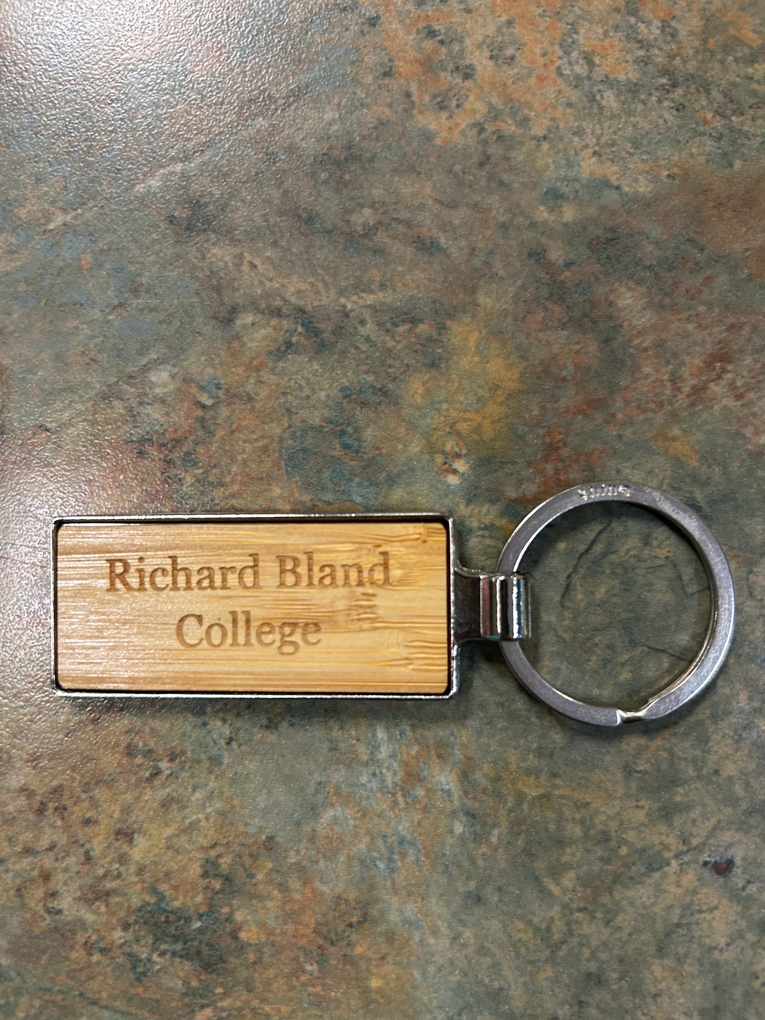 2.5" X 1" bamboo and zinc alloy keychain with a split ring attachment.