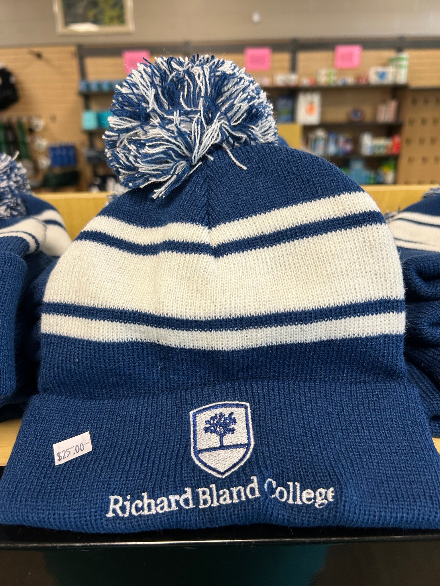 Pom beanie embroidered with the RBC logo. 100% acrylic rib knit beanie featuring a two-tone pom pom on top. Features cuff that folds approx. 3"h and stretches to fit most adult head sizes. HAND-WASH ONLY!